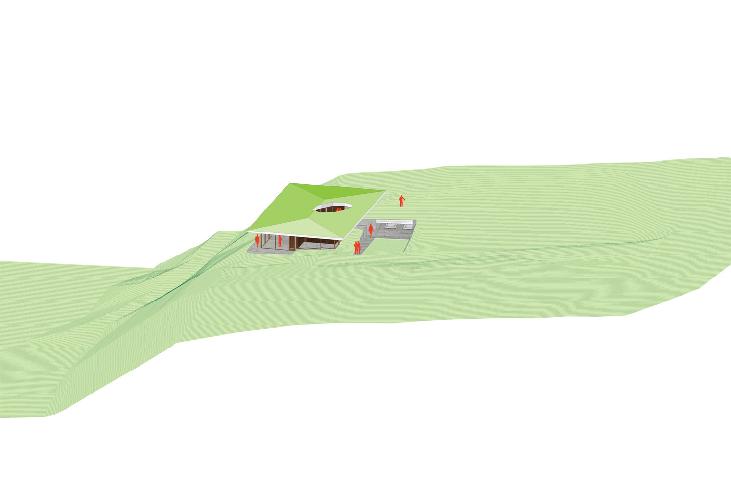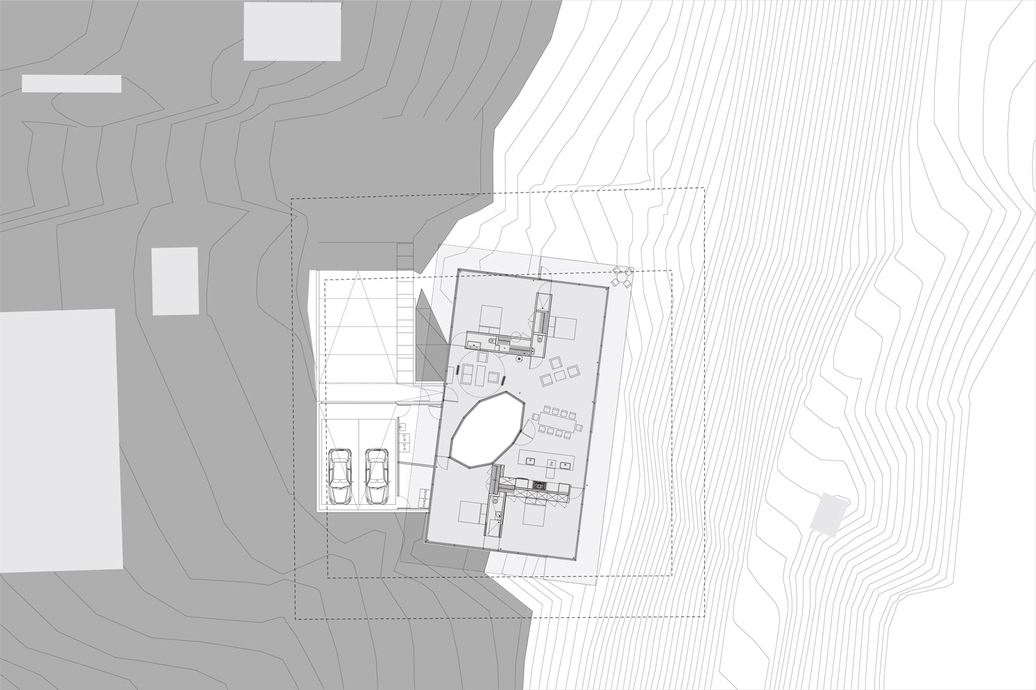 In order to introduce light and foliage into the house itself, the architect carved out an oblong, faceted courtyard within the living and dining areas. Two L-shaped cores at opposite corners of the main floor define both the master bedroom and the kitchen spaces. From the living room, a glazed door opens onto the terrace cantilevered over the steep riverbank. ![]()