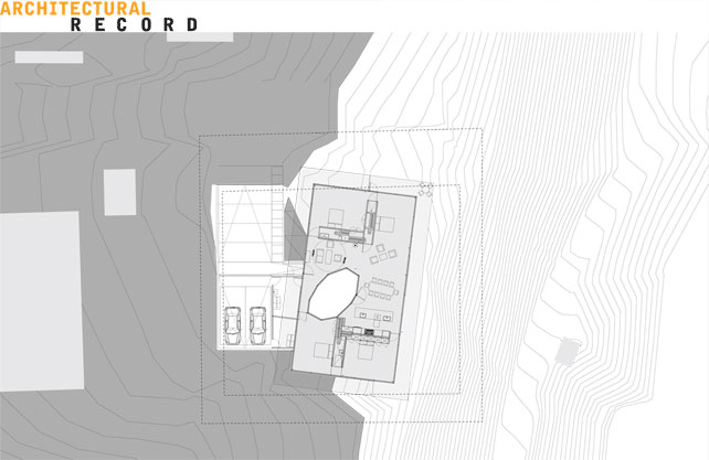 Solution: The architect designed a one-story glazed, rectilinear house with deep overhangs to fit into the gently sloping site. To access the main floor, the family members gradually descend a concrete stair from the parking area to the entrance. ![]()